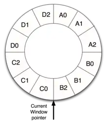 En comparación, la arquitectura SPARC de Sun Microsystems proporciona visibilidad simultánea en cuatro conjuntos de ocho registros cada uno. Tres conjuntos de ocho registros cada uno son "de ventana". Ocho registros (i0 a i7) forman los registros de entrada al nivel de procedimiento actual. Ocho registros (L0 a L7) son locales al nivel de procedimiento actual, y ocho registros (o0 a o7) son las salidas del nivel de procedimiento actual al siguiente nivel llamado. Cuando se llama a un procedimiento, la ventana de registro se desplaza en dieciséis registros, ocultando los registros de entrada antiguos y los registros locales antiguos y haciendo que los registros de salida antiguos los registros de entrada nuevos. Los registros comunes (registros de salida antiguos y nuevos registros de entrada) se utilizan para pasar parámetros. Finalmente, ocho registros (g0 a g7) son visibles globalmente para todos los niveles de procedimiento.