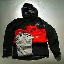 - Tercera capa' o capa de protección - Es la capa que protege al resto de capas de las inclemencias del clima. Es una capa muy específica del ambiente a que esté expuesta. Si es un clima lluvioso se requiere que sea impermeable, suelen ser habituales los textiles con membrana (como Gore-Tex), así como los ponchos de plástico. Si hay excesivo viento los textiles evitan la infiltración de corrientes de aire (Windstoppers).