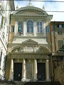 | Iglesia de los santos Jerónimo y Francisco Javier, antigua Biblioteca Universitaria | Edificada en 1650 por Francesco Maria Balbi como iglesia del colegio de los jesuitas, alberga un notable ciclo de frescos barrocos de Domenico Piola. | ![]() |