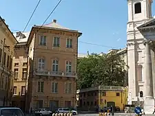 | Iglesia de los santos Víctor y Carlos | Fue construida por los carmelitas descalzos en honor de su protector Carlos Borromeo, según el proyecto de Bartolomeo Bianco, e inaugurada en 1635. La fachada de 1743 fue edificada a expensas de Gerolamo Durazzo. En el interior de la majestuosa decoración barroca destacan obras maestras pictóricas de Domenico Piola, Orazio y Lorenzo de Ferrari, y esculturas de Anton Maria Maragliano y Alessandro Algardi. |