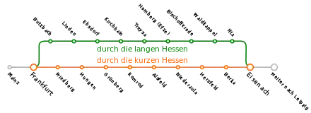 Partiendo de Maguncia, la carretera discurría paralela al Meno hasta Höchst (anteriormente Elisabethenstraße) a través del territorio del Principado de Maguncia. Desde allí siguió una antigua ruta más allá de Nidda cerca de Nied y a través del bosque de Nied (Rödelheimer Straße, hoy Oeserstraße), hasta Rebstock (distrito de Fráncfort), donde el Biegwald (Biegweg ) pasaba por la colina Ginnheim, luego hacia el norte. vía Fráncfort-Bockenheim vía Dornbusch (Marbachweg) y Lohrberg hasta Bergen-Enkheim. A partir de aquí mantuvo la ruta en la cresta entre el Nidder y el Kinzig.