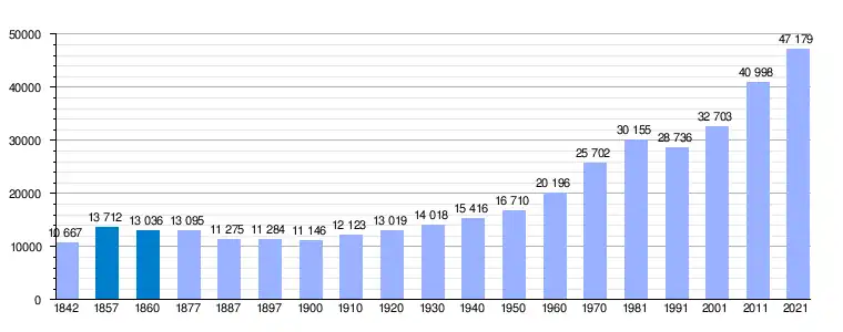 | Gráfica de evolución demográfica de Vic[17] entre 1842 y 2021 |