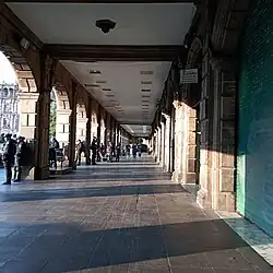 El primer edificio colonial fue construido en este lado de la cuadra por Melchor Davila, dedicado para la venta de alimentos y otras mercancías. Desde este edificio se forman los locales comerciales al este y al norte hasta llegar a Santo Domingo.[1] Mucho del espacio ahí fue otorgado a Don Rodrigo de Albornoz, Conde de Santiago, secretario del Emperador Carlos V y el contador de la Nueva España.[5] En 1524, el consejo de la ciudad aprobó una ordenanza estableciendo que los dueños de las propiedades que se encontraran frente al Zócalo podían construir arcos frente a sus establecimientos y rentar el espacio a los mercantes. La razón de esta ordenanza era que el Zócalo tenía severos problemas de hundimientos. Estos arcos cubiertos podrían proveer una alternativa al Zócalo abierto, especialmente durante la temporada de lluvia.[6]