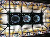 El aspecto más llamativo del inmueble es el vitral de Tiffany, una estructura con más de 20 mil piezas de vidrio de colores, esta pieza Art Nouveau fue diseñada por el artista Jacques Grüber y llevada a México en 1906, para decorar el techo del Centro Mercantil. El vitral se caracteriza por el uso de formas vegetales abundantes y entrelazadas, coloridas, con guirnaldas reverberantes y hojas aisladas. Aunque este permitía el paso de la luz solar, se colocaron más de cien lámparas para iluminarlo en la noche. Debido a su monumentalidad y belleza se convirtió en Patrimonio Cultural de la Nación, debido a que el Instituto Nacional de Bellas Artes lo consideró como una obra de arte.[14]