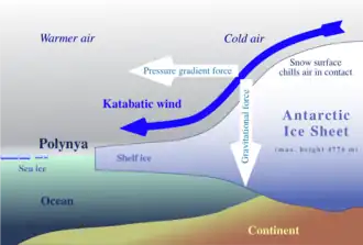 Sobre la Antártida y en Groenlandia, inmensos vientos catabáticos fríos soplan casi todo el año. Se trata de los vientos de Inlandsis, como señala Pierre George en su diccionario de geografía (editorial Akal).
