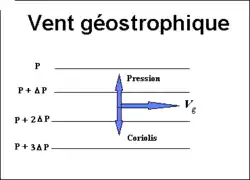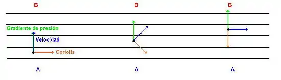 No obstante, como la Tierra rota sobre sí misma, no es un sistema inercial, por lo que aparece una fuerza ficticia como la de Coriolis. La aceleración de Coriolis tiende a desviar los flujos a su derecha en el hemisferio norte y a la izquierda en el hemisferio sur. Si se deja actuar a la fuerza de Coriolis suficiente tiempo y se supone que no existe rozamiento se llega a establecer un flujo paralelo a las isobaras, en donde la fuerza de Coriolis contrarresta exactamente la fuerza generada por el gradiente de presión, por lo que la situación es estable.