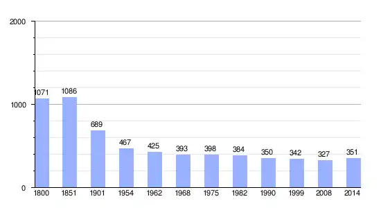 Los datos demográficos contemplados en este gráfico de la comuna de Vieux-Mareuil[4] se han cogido de 1800 a 1999 de la página francesa EHESS/Cassini, y los demás datos de la página del INSEE.[5]