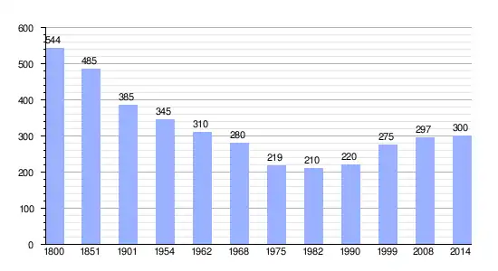 Los datos demográficos contemplados en este gráfico de la comuna de Vieux-Pont-en-Auge[4] se han cogido de 1800 a 1999 de la página francesa EHESS/Cassini, y los demás datos de la página del INSEE.[5]