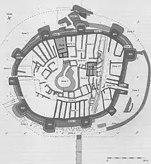 Se ubica en una zona inundable del río Corb y fue construida durante la Primera Edad del Hierro manteniéndose habitada ininterrumpidamente durante cuatrocientos años. De forma ovalada se estructura alrededor de una cisterna de agua que ocupa el centro de una plaza junto a la cual se van levantando las viviendas de forma rectangular. Todo el conjunto está rodeado de una muralla torreada de cinco metros de ancho y otros cinco de alto con 12 torres semicirculares y un foso inundable de 15 metros de anchura y 4 de profundidad en el que se abren dos puertas de acceso de pequeñas dimensiones. Rodeando el complejo había una barrera de piedras clavadas en el suelo, sistema defensivo denominado chevaux-de-frise, que impedían el paso a pie o a caballo. Estas características defensivas la hacían casi inexpugnable.[1]