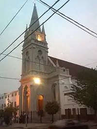 Su piedra fundamental es colocada el día 15 de marzo de 1891. Cuando sus muros llegaban al techo su construcción fue interrumpida. Reanudada después, fueron modificados los planos originales pertenecientes al ingeniero Gino Aloisi, conservando siempre el estilo neogótico; pero el proyecto inicial de que tuviera tres naves y dos torres se truncó. Razones de economía, insalvables y de gran presión, determinaron que sea erigida como se la observa ahora – tras la posterior dirección de otro arquitecto, Rosendo Martínez – con una única nave central y una sola torre de casi treinta y cinco metros de altura, la que recién se empezó a construir en 1919. Con motivo de celebrarse el centenario de su inauguración, durante el año 2008 fue restaurado. Es, sin lugar a dudas, el emblema histórico y arquitectónico de la ciudad.