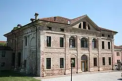 ![]() Villa Thiene. Su obra en ladrillo externo ha sido desnudado del estuco que originalmente lo cubriría. Hay también muchos agujeros realizados en tiempos de guerra, para extraer el metal usado en la construcción de la villa.