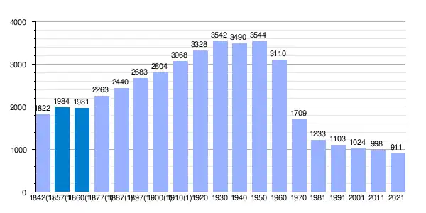 | Gráfica de evolución demográfica de Villagarcía de la Torre[1] entre 1842(1) y 2021 |