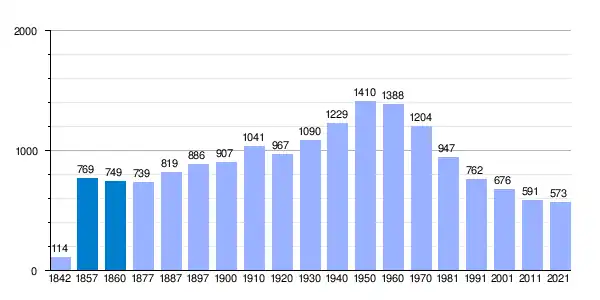 | Gráfica de evolución demográfica de Villaluenga de la Vega[1] entre 1842 y 2021 |