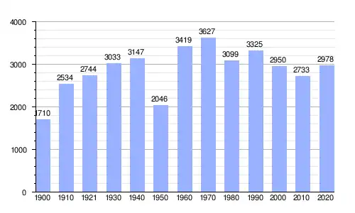 En 2020 el 48 % de la población (1430 personas) eran hombres y el 52 % (1548 personas) eran mujeres. El 59.7 % de la población, (1778 personas), tenía edades comprendidas entre los 15 y los 64 años.[6]