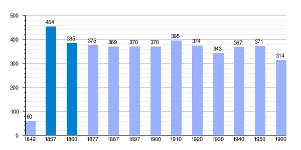| Gráfica de evolución demográfica de Villanueva de Puerta[14] entre 1842 y 1960 |