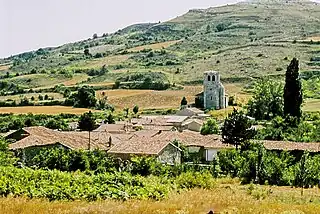 - [6][2] Se ubica en un alto. Obra de fines del siglo XVI. Construida en mampostería con refuerzos de sillares. Dos naves con bóvedas. De su pasado románico hay elementos reaprovechados fuera de contexto. Tiene una sencilla portada románica. Pila bautismal románica, similar a las de Melgosa de Villadiego y Hormicedo. Mesa de altar románica usada como banco. Torre con escalera de caracol adosada lateralmente con base renacentista (siglo XVI) y remate barroco (siglo XVIII). Capillas adosadas (lateral y cabecera). Coro del siglo XVII de tipo arte morisco renaciente; tiene canecillos de dos lóbulos en forma de perfil de ese, divididos por una cuerda o soga en dos partes simétricas; motivos geométricos de tipo manierista como son los rectángulos divididos en compartimentos cuadrados y ovalados; predominan en el coro las acanaladuras a modo de triglifos, redes rombos, óvalos y medias lunas, ornamentación que se debe considerar como un arcaísmo a nivel local.[15]