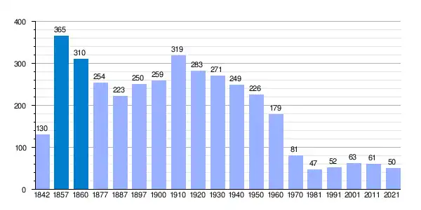 | Gráfica de evolución demográfica de Villares de Jadraque[3] entre 1842 y 2021 |