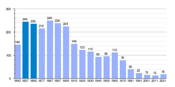 | Gráfica de evolución demográfica de Villarmentero de Campos[2] entre 1842 y 2021 |