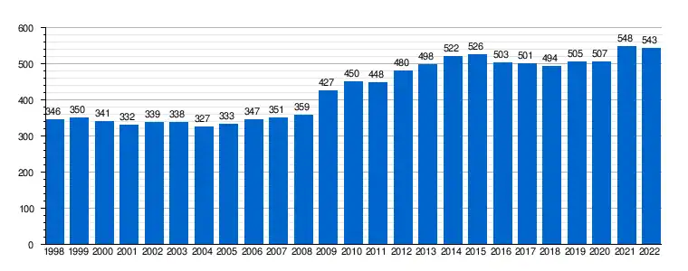 | Gráfica de evolución demográfica de Villastar[5] entre 1998 y 2022 |