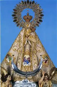 - Por último, la que permanece en el camarín de la Catedral, y que nunca lo abandona, es sin duda la de mayor valor histórico y artístico, y ocupa la capilla que lleva su nombre a la derecha del altar de la Catedral de Albacete. Esta figura fue salvada de la quema en la guerra civil por una familia de Albacete, apodada Los Cachorros. Las cabezas primitivas que se detallan encontradas en el acta notarial transcrita se pueden venerar todos los años el día 27 de mayo día de la coronación, cuando se abre el camarín. Presenta una media luna con dos estrellas en los extremos en la que aparece una inscripción con la firma, fecha y nombre del donante, el regidor, Diego de Molina Montesinos, que fue realizada en 1654 por Manuel López.[13]