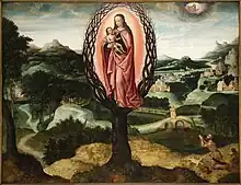 Ainsworth describe la oscuridad de la iconografía como algo sin precedentes en la pintura flamenca. [22] El historiador del arte Bernhard Ridderbos ve el panel como una "imagen de culto milagrosa" única, más que como una típica ilustración tardomedieval de una escena bíblica. [26] Su tamaño de 14,7 x 12,4 cm sugiere que casi con certeza se pretendía que fuera un objeto devocional personal íntimo con la atención del espectador dirigida únicamente a la madre, el niño y el árbol; [27] su presentación e inmediatez atrae hasta el punto de convertirse en una "extensión subjetiva" de la realidad. [2]