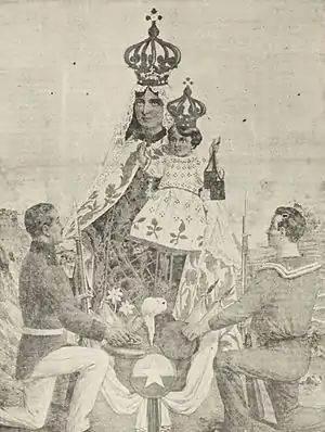 Durante el conflicto entre Chile, Bolivia y Perú, los soldados chilenos se encomendaban a la Virgen del Carmen, tanto los oficiales del ejército como los soldados. La mayor parte de la tropa que participó en las diversas fases de la guerra llevaban consigo el escapulario del Carmen, al igual que la población civil. Tras la declaración de guerra de los aliados Bolivia y Perú, la iglesia católica prestó servicios relacionados con la salud y alivio espiritual de los combatientes. De acuerdo a la narrativa relacionada con el conflicto bélico, se estableció que «la posesión del escapulario, medallitas e imágenes les daba a los soldados el valor para salir a batallar, estos elementos materiales significaron una mayor cercanía a la figura materna y protectora que tanto necesitaban».[9] Uno de los casos notables de su uso fue protagonizado por Arturo Prat, quien días antes del combate naval de Iquique, le escribió a su tía que en la noche del embarque en la Esmeralda los marinos recibieron cada uno el escapulario del Carmen para la protección en la batalla. Después del combate, los marinos peruanos, al revisar al caído Prat, encontraron el escapulario en medio de sus prendas, según consta el inventario entregado al comandante del monitor Huáscar, Miguel Grau.[15][16][17][18]