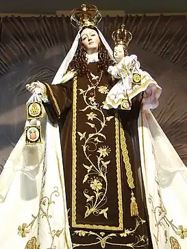 La advocación mariana de la Virgen del Carmen (también llamada Chinita, Madre de Chile, Augusta patrona de Chile, Reina de Chile, Reina del Tamarugal o simplemente Carmelita) es una tradición católica traída desde España a América en 1595[1] (o 1680)[2] por los frailes agustinos, quienes trasladaron consigo la primera imagen.[1] Durante el proceso de emancipación nacional, la figura fue instaurada históricamente como la «Patrona de Chile».[3] José de San Martín, general del Ejército Libertador, proclamó que la Virgen del Carmen recibía el título de «Patrona del Ejército de los Andes» y Bernardo O'Higgins la denominó como «Patrona y General de las Armas Chilenas» en las vísperas de la batalla de Chacabuco.[4]