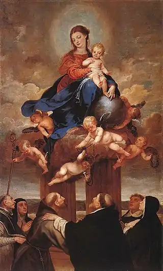 La obra pictórica de la Virgen del Rosario tiene unas dimensiones de 3,56 × 2,18 metros, y responde a la técnica de óleo sobre lienzo. La pintura es una composición triangular con dos niveles diferenciados jerárquicamente. En la parte inferior se representa el mundo terrenal y en la superior, el celestial.