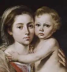La obra presenta como únicos protagonistas a María y su hijo Jesús, formando ambos una composición piramidal de aspecto sólida y monumental. María representada, de cuerpo entero, casi como una adolescente se encuentra en posición sentada sobre un banco de piedra con el Niño en sus brazos en pie y apoyado sobre la rodilla izquierda de su madre, un rosario es sostenido por las manos derechas de ambos. La colocación de los personajes en esta forma, propicia el encuentro de las dos caras, madre e hijo, a la misma altura rozándose suavemente sus mejillas, esta imagen da muestra de una gran dulzura y ternura entre ambos. A diferencia de otras iconografías del mismo tipo pintadas por Velázquez o Alonso Cano, donde los personajes tienen los ojos bajos o las miradas se cruzan entre ambos, Murillo presenta tanto a la madre como al hijo con la mirada al frente dirigida al espectador. El niño se encuentra desnudo, cubierto levemente con un paño blanco que sujeta su madre. María está vestida con unos ropajes en rojo y azul de abundantes pliegues y un ligero velo cubre su pelo rodeando su escote hasta caer sobre su cadera. Las vestiduras presentan abundantes pliegues realizadas con unas pinceladas sueltas con toques de luces colocadas en todo el ropaje que sugieren unas calidades influenciadas de la pintura flamenca y genovesa de la época. Todo el conjunto se encuentra sobre un fondo neutro y obscuro que resalta el gran efecto de volumen de la obra.[11][12]