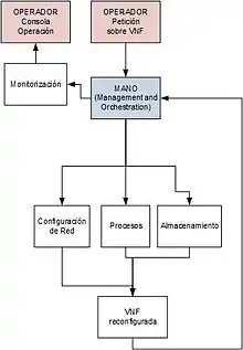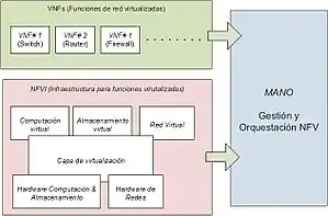 - Management and Orchestration (MANO): MANO se define como un bloque separado dentro de la arquitectura, que interactúa tanto con NFVI como con VNF. Se delega en esta capa toda la gestión de los recursos de la capa de infraestructura (incluyendo la creación, borrado y reserva de espacio necesarios para la gestión de las diferentes máquinas virtuales).
