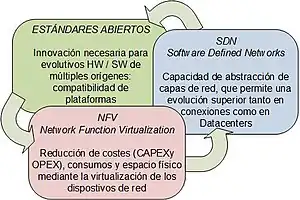 | Descripción | Hacer la red programable (separación de planos de control y datos, creación de APIs para ITXs | Transformación de HW en apps SW que se pueden ejecutar en entornos virtualizados (y centralizados en SRVs) |
