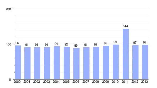 | Gráfica de evolución demográfica de Viscarret-Guerendiáin entre 2000 y 2013 |