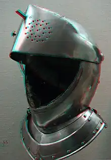 - la visera propiamente dicha, en la cual había agujeros o hendeduras para proporcionar el paso libre del aire y facilitar la visión: esta parte defendía los ojos