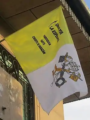 Bandera con el lema oficial «Unidos por la Esperanza» colocada por el Vicariato apostólico de la ciudad de Iquitos en honor a la visita del papa Francisco.