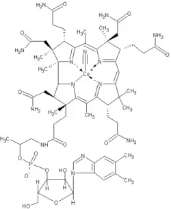 Bioquímicamente hablando la vitamina B12 es la más compleja de las vitaminas. El término cobalamina hace referencia a un grupo o familia de compuestos con una estructura específica. La B12 es una de estas cobalaminas que resulta de la unión asimétrica de cuatro anillos pirrólicos, formando un grupo macrocíclico casi planar (núcleo de corrina) en torno a un ion central de cobalto. El anillo de corrina es similar al anillo porfirínico, que también puede ser encontrado en el grupo hemo, la clorofila y en los citocromos; y se diferencia de estos por su asimetría en las uniones entre los grupos pirrólicos. En esta estructura, el cobalto posee seis valencias, cuatro de las cuales forman un enlace covalente con los átomos de nitrógeno de los anillos pirrólicos. La quinta valencia de coordinación siempre se encuentra unida a un pseudonucleótido complejo, el 5,6-dimetilbencimidazol, casi perpendicular al núcleo y, finalmente, cuando la sexta valencia se une a diversos radicales produce los diferentes derivados de la cobalamina. Cuando se une un grupo de cianuro (CN-) forma la cianocobalamina, cuando la unión es con un grupo hidroxilo compone la hidroxicobalamina, cuando se conecta a un grupo metilo (CH3-) crea la metilcobalamina o la desoxiadenosilcobalamina; con el grupo de C5' de la desoxirribosa de esta última, forma el enlace covalente con el Co.[14]