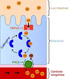 La forma activa de la vitamina D (calcitriol) penetra en la célula donde se une al receptor de vitamina D (RVD), también llamado VDR por las iniciales de su denominación en inglés (vitamin D receptor). Esta unión activa el receptor y se forma un complejo que penetra en el núcleo celular, donde actúa como un factor de transcripción que modula la expresión de determinados genes que codifican proteínas de transporte, como el TRPV6 y la calbindina. Estas proteínas de transporte están presentes en las células del intestino delgado y permiten la absorción del calcio procedente de los alimentos.[11][12]