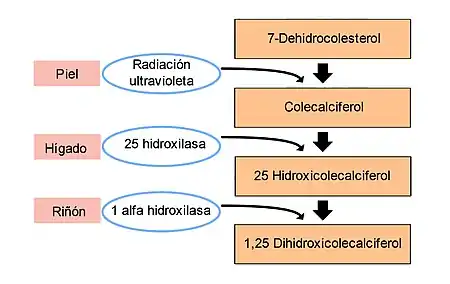 Cuando los rayos ultravioletas entran en contacto con la piel, el 7-dehidrocolesterol se transforma en colecalciferol (vitamina D3). El colecalciferol es en realidad una prohormona y no es biológicamente activo. Para activarse debe someterse a dos hidroxilaciones, la primera en el hígado formando 25-hidroxicolecalciferol (calcidiol) y la segunda en el riñón formando 1,25-dihidroxicolecalciferol, también llamada calcitriol, que es la forma activa.[13]