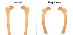 El déficit de vitamina D ocasiona disminución de la mineralización ósea, conduciendo a enfermedades en los huesos, tales como raquitismo en niños y osteomalacia en adultos. El raquitismo provoca diversos síntomas, entre ellos crecimiento deficiente, retraso en el crecimiento de los dientes, debilidad, cráneo ablandado en los niños y deformidades óseas irreversibles.[2] Por otra parte, el déficit de vitamina D en los adultos provoca osteomalacia y es uno de los factores que puede contribuir a la aparición de osteoporosis y sus complicaciones como la fractura de cadera, importante causa de mortalidad y discapacidad en ancianos.[2] Algunas investigaciones sin confirmar indican que el déficit de vitamina D puede estar vinculado a la merma de la función cognitiva[21] y al cáncer de colon.