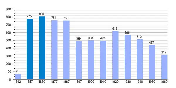 | Gráfica de evolución demográfica de Viu de Llevata[1] entre 1842 y 1960 |