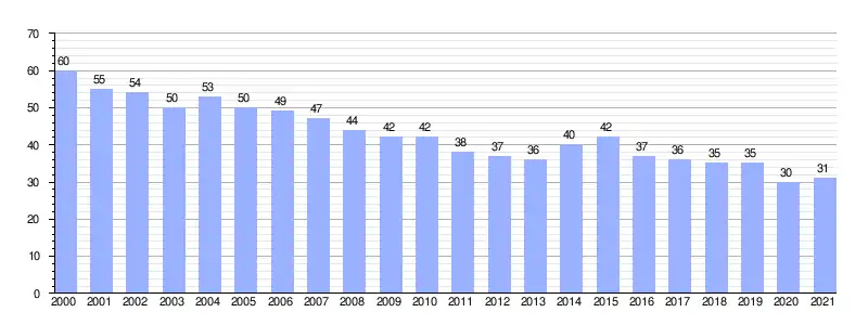 | Gráfica de evolución demográfica de Vivar de Fuentidueña[5] entre 2000 y 2021 |
