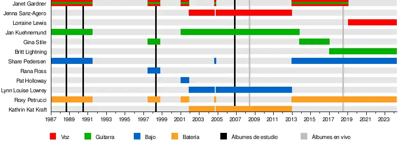 - Janet Gardner: voz, guitarra rítmica y pandereta (1983-1991, 1997-1998, 2001, 2004, 2013-2019)