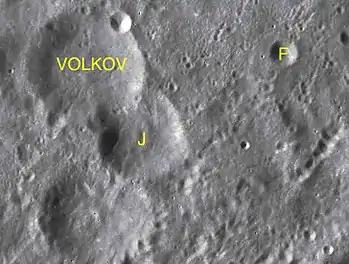 Volkov es un cráter de impacto localizado en la cara oculta de la Luna. Se encuentra al norte del prominente cráter Tsiolkovskiy, y al este-sureste de Dobrovol'skiy. Superpuesto al borde suroriental de Volkov se halla el cráter satélite Volkov J. Los dos se han combinado para formar una figura con forma de ocho. El cráter Lander está unido al borde suroeste de Volkov J, convirtiendo la formación en un triple cráter.