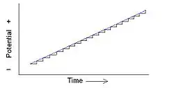 La voltamperometría escalonada es un derivado de la voltamperometría de barrido lineal[1][2]. En la voltamperometría de barrido lineal, se mide la corriente en un electrodo de trabajo mientras se barre linealmente en el tiempo el potencial entre el electrodo de trabajo y el electrodo de referencia. La oxidación o reducción de las especies se registra como un pico o un valle en la señal de corriente al potencial en el que la especie comienza a oxidarse o reducirse.