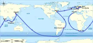 La salida se dio el 11 de octubre de 2008 en Alicante, España. Los puertos por los que transcurrió fueron: Ciudad del Cabo (Sudáfrica), Kochi (India), Qingdao (China), Boston (Estados Unidos), Galway (Irlanda), Gotemburgo (Suecia) y San Petersburgo (Rusia).