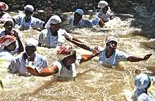 La peregrinación es parte de la cultura religiosa haitiana.[246] A finales de julio, los peregrinos vuduistas visitan Plaine-du-Nord cerca de Bwa Caiman, donde según la leyenda tuvo inicio la revolución haitiana. Allí se hacen sacrificios y los peregrinos se sumergen en los twou (pozas de barro). Los peregrinos suelen congregarse ante la Iglesia de Santiago el Mayor, siendo Santiago equiparado con el loa Ogou. Otro lugar de peregrinaje es Saint d'Eau, una montaña asociada con el loa Èzili Dantò.[247] Los peregrinos visitan un sitio fuera de la ciudad de Ville-Bonheur donde se afirma que Èzili apareció una vez, y se bañan bajo las cascadas.[248] Los peregrinos haitianos suelen llevar cuerdas de colores alrededor de la cabeza o la cintura mientras realizan su peregrinación.[246] Los académicos de la religión Terry Rey y Karen Richman creen que esta costumbre puede derivar de una costumbre congoleña, kanga («atar»), durante la cual se ataban ritualmente objetos sagrados con una cuerda.[249]