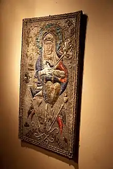 La creación de obras sagradas es importante en el vodú o vudú.[109] Objetos votivos utilizados en Haití están tradicionalmente hechos de materiales industriales, como hierro, plástico, lentejuelas, porcelana, oropel y yeso.[17] Los altares, o pè, a menudo contienen imágenes (típicamente litografías) de santos católicos. Desde su desarrollo a mediados del siglo XIX, la cromolitografía también ha tenido un impacto en la imaginería vudú, facilitando la amplia disponibilidad de imágenes de los santos católicos que son equiparados con los loa.[163] Varios vuduistas han hecho uso de variados materiales disponibles a la hora de construir sus santuarios. Cosentino se encontró con un santuario en Puerto Príncipe en el que el Barón Samedi era representado por una estatua de plástico de Papá Noel con un sombrero negro,[164] y en otro por una estatua del personaje de Star Wars Darth Vader.[165] En Puerto Príncipe, es común que los vuduistas pongan cráneos humanos en sus altares para las gedes.[115] Muchos practicantes también tienen altares dedicados a sus ancestros en sus hogares, a los que dirigen ofrendas.[166]