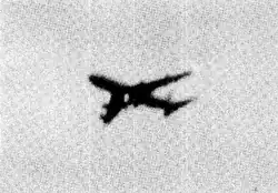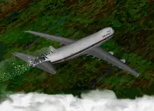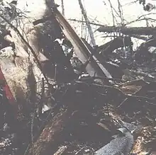 ![]() Imagen histórica del avión accidentado fotografiado minutos antes del accidente. Falta una gran parte del estabilizador vertical en la cola. | ||