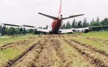 La aeronave comenzó a desacelerar gradualmente, saliéndose por el final de la pista sobre una zona pantanosa, impactando con una antena de radio al hacerlo, y finalmente se detuvo con su morro reposando sobre la carretera perimetral. El terreno al otro lado de la carretera formaba parte de un campo de golf.