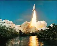 ![]() El Transbordador espacial Columbia segundos después de la ignición de los motores en la misión STS-1 |