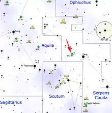 El W40 región de formación de estrellas está proyectada en el cielo en la dirección del Serpens-Aquila Rift, una masa de nubes oscuras por encima del plano Galáctico en las constelaciones Aquila, Serpens, y orientales Ophiuchus.[7] La extinción alta de estos foreground las nubes significa que estas miradas de región unimpressive en el ópticos, a pesar de ser un de los sitios más cercanos de formación de estrella masiva. También residiendo cercano en el cielo es Serpens sur, una nube oscura infrarroja que activamente está formando estrellas, y el Serpens Main.[8]